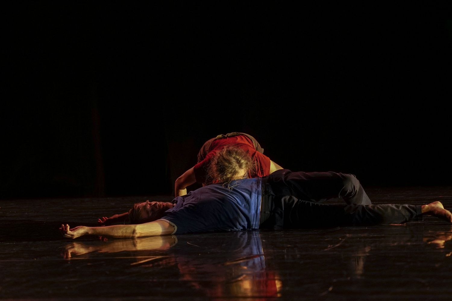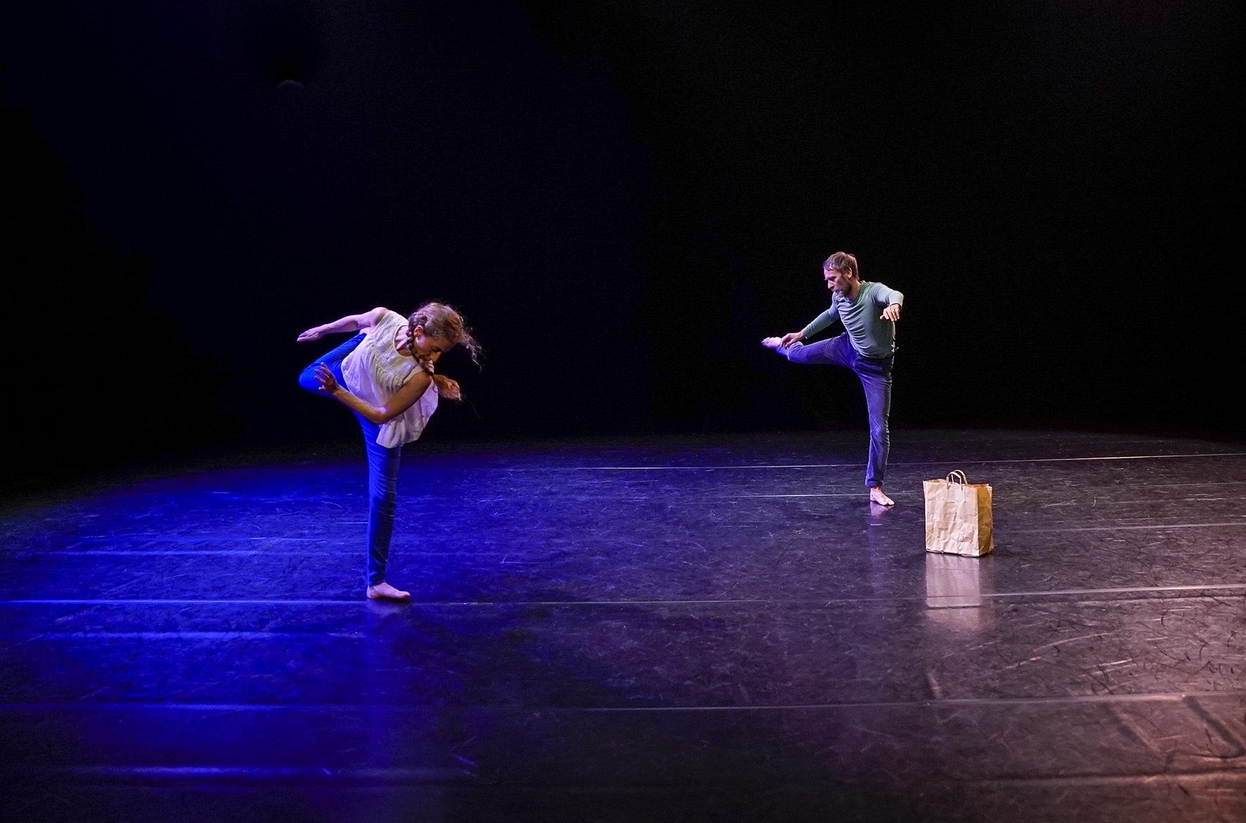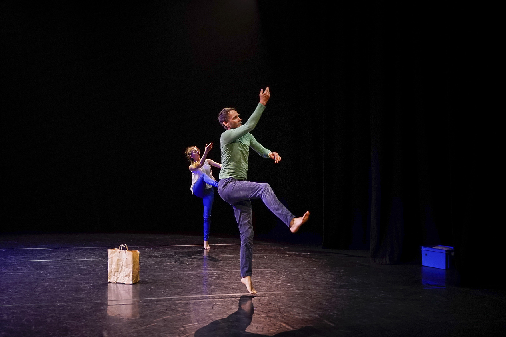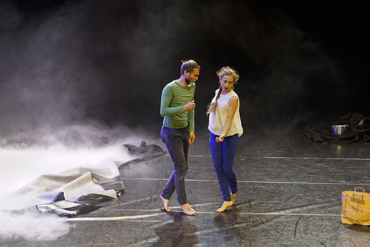 Marc Lacourt et Ambra Senatore ont eu envie de créer, ensemble, un duo né de leur imagination commune. Pleins d’esprit facétieux et de fantaisie débordante, ils construisent et déconstruisent à vue le théâtre et la danse. Dans un ballet de départs et de retrouvailles, le duo se fait conteur, lancé dans des souvenirs et des bribes de récits de vie. Leurs histoires zigzaguent, rebondissent, hésitent, repartent, et leur danse hybride, subtile et touchante, avance vers un ailleurs non défini. Ils avancent simplement sur le chemin de la vie, celui qu’on s’imagine, qu’on choisit, ou qu’on subit. La route ne sera pas sans encombres, faite d’accros et de détours… Mais peu importe la destination, pourvu qu’on lève les voiles ! La pièce s’est construite au fil des intuitions, avec pour balises les étapes de travail ouvertes aux spectateurs et à leurs retours. Telle une petite barque navigant sans direction précise mais finissant par arriver à bon port. Et cela fonctionne ! Ce duo plein d’une humanité débordante, navigue à vue mais toujours avec cette précision dans le désordre apparent qui définit le travail d’Ambra Senatore et Marc Lacourt.